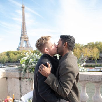 We finally arrived at the bridge, Pont de Bir-Hakeim, and walked towards the pedestrian overlook, which had incredible views of the Eiffel Tower. In the distance, I could see a beautiful setup with flowers and music playing, but I assumed it was for a bride and groom who were doing a photoshoot on the bridge at the same time. As we approached the pedestrian overlook, a French butler suddenly emerged to greet us, letting me know that this was all for me. Everything that followed was simply perfect.
